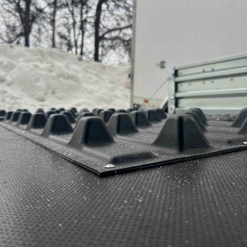 - Контролируемый заезд: 11 направляющих создают четкую колею («коридор»), которая не дает лыжам или колесам соскользнуть в сторону. Это позволяет безопасно загонять технику на прицеп даже в одиночку.
