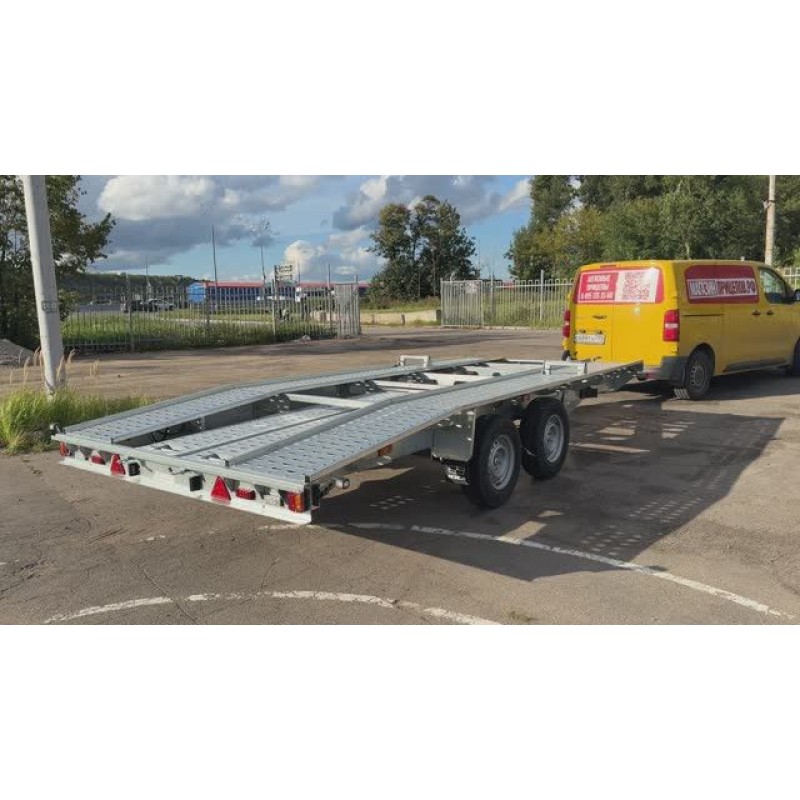 Специализированный двухосный прицеп с оцинкованной конструкцией от компании «МЗСА» для перевозки автомобилей. Представляет собой оцинкованную раму со стальным настилом, размер платформы 5100*2200 мм. Для заезда авто модель комплектуется оцинкованными стальными аппарелями для заезда в специальных отсеках для их перевозки. Прицеп имеет рессорную подвеску и тормоз наката.